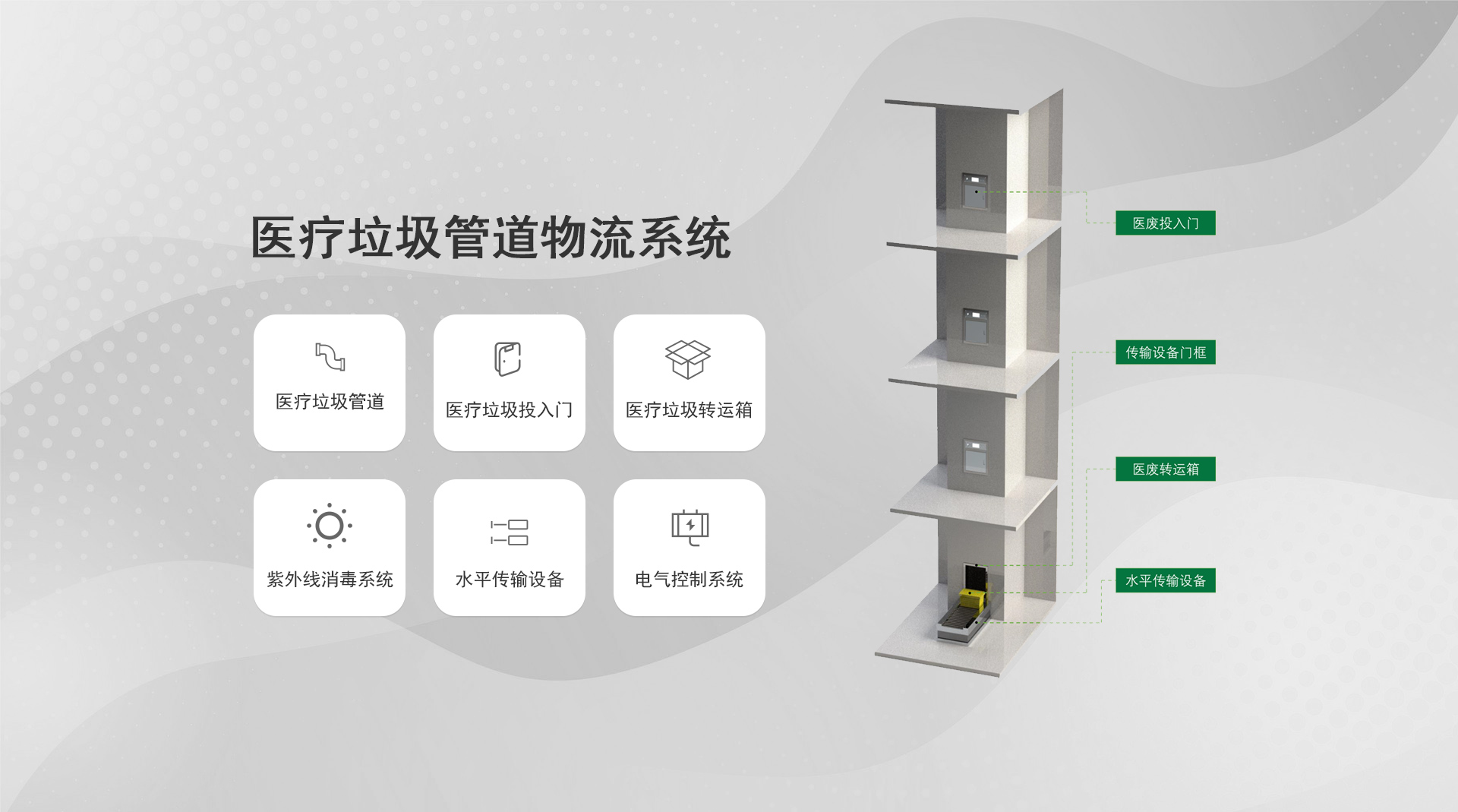 系統(tǒng)簡(jiǎn)介:通過氣力式輸送管道對(duì)醫(yī)院內(nèi)的垃圾和污衣被服進(jìn)行收集,是一種對(duì)垃圾實(shí)行全封閉、壓縮化、集裝化收運(yùn)的現(xiàn)代垃圾運(yùn)輸及匯集方式...